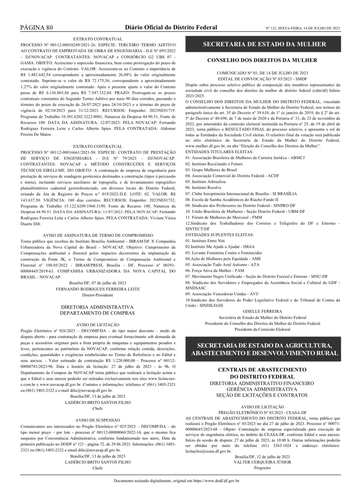 - j) 14/07/2023 – divulgação no Diário Oficial do Distrito Federal e no sítio eletrônico da Secretaria de Estado da Mulher do Distrito Federal, www.mulher.df.gov.br, na aba “Eleição do Conselho dos Direitos da Mulher”, do resultado da eleição;
