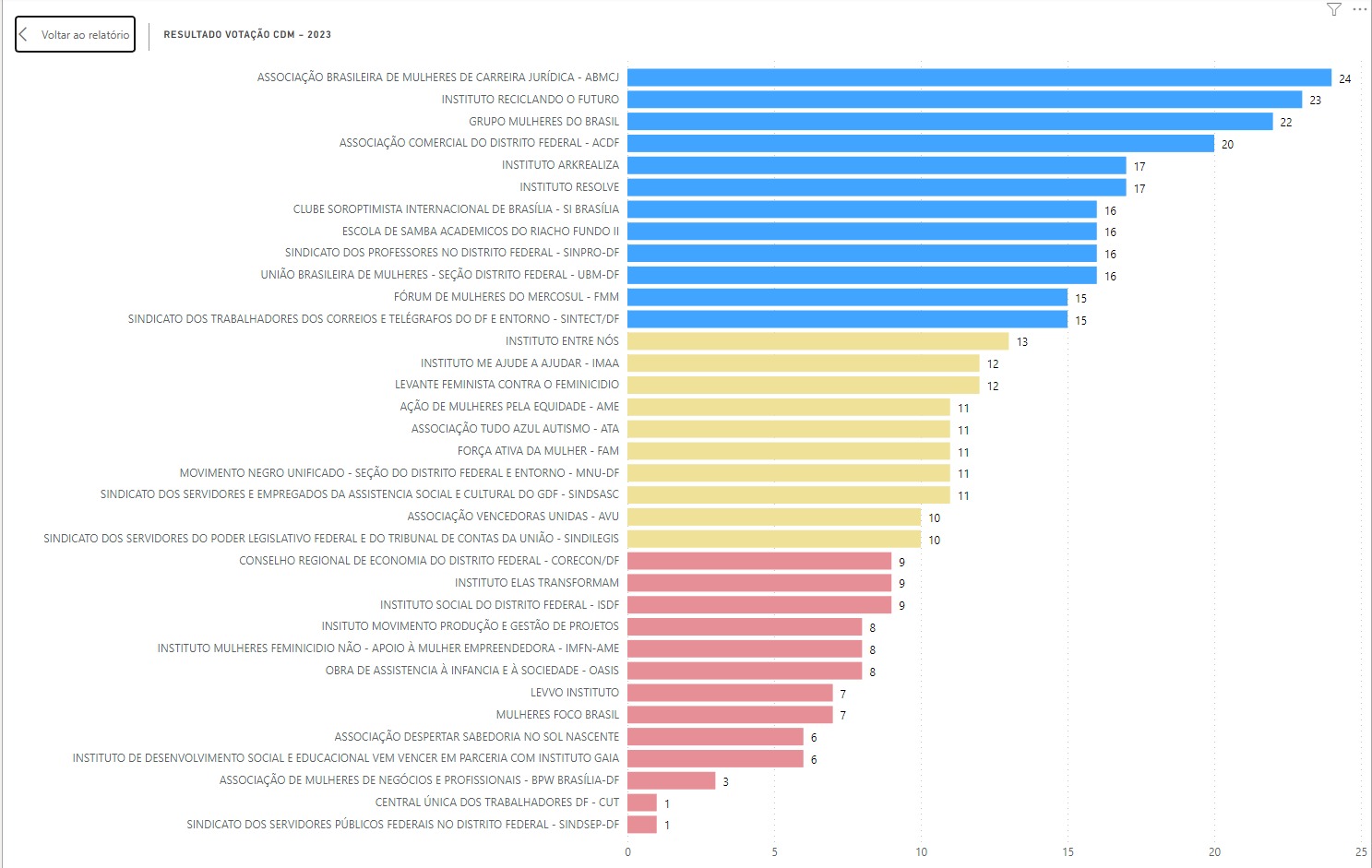 Este processo seletivo será regido por edital publicado no DODF nº76, de 24 de Abril de 2023 (Página 88), visando o preenchimento de 12 (doze) vagas do Conselho dos Direitos da Mulher do Distrito Federal – CDM/DF por organizações da sociedade civil do Distrito Federal. O processo seletivo será composto de 3 (três) etapas: inscrição, habilitação e seleção, sendo esta última etapa efetivada por meio de eleição on-line, na qual votam e são votadas as organizações da sociedade civil do Distrito Federal habilitadas pela comissão eleitoral.